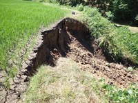 田んぼに大きな亀裂が入ったことで水が地下に浸透し、土手が崩落してしまったのです。