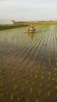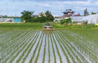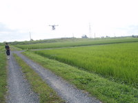 この時期はカメムシ対策として、天然素材から抽出されているオイルと水を混合してドローンで圃場に散布しております。