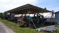 圃場の除草作業の合間に、トラクターや作業機を収納する車庫を